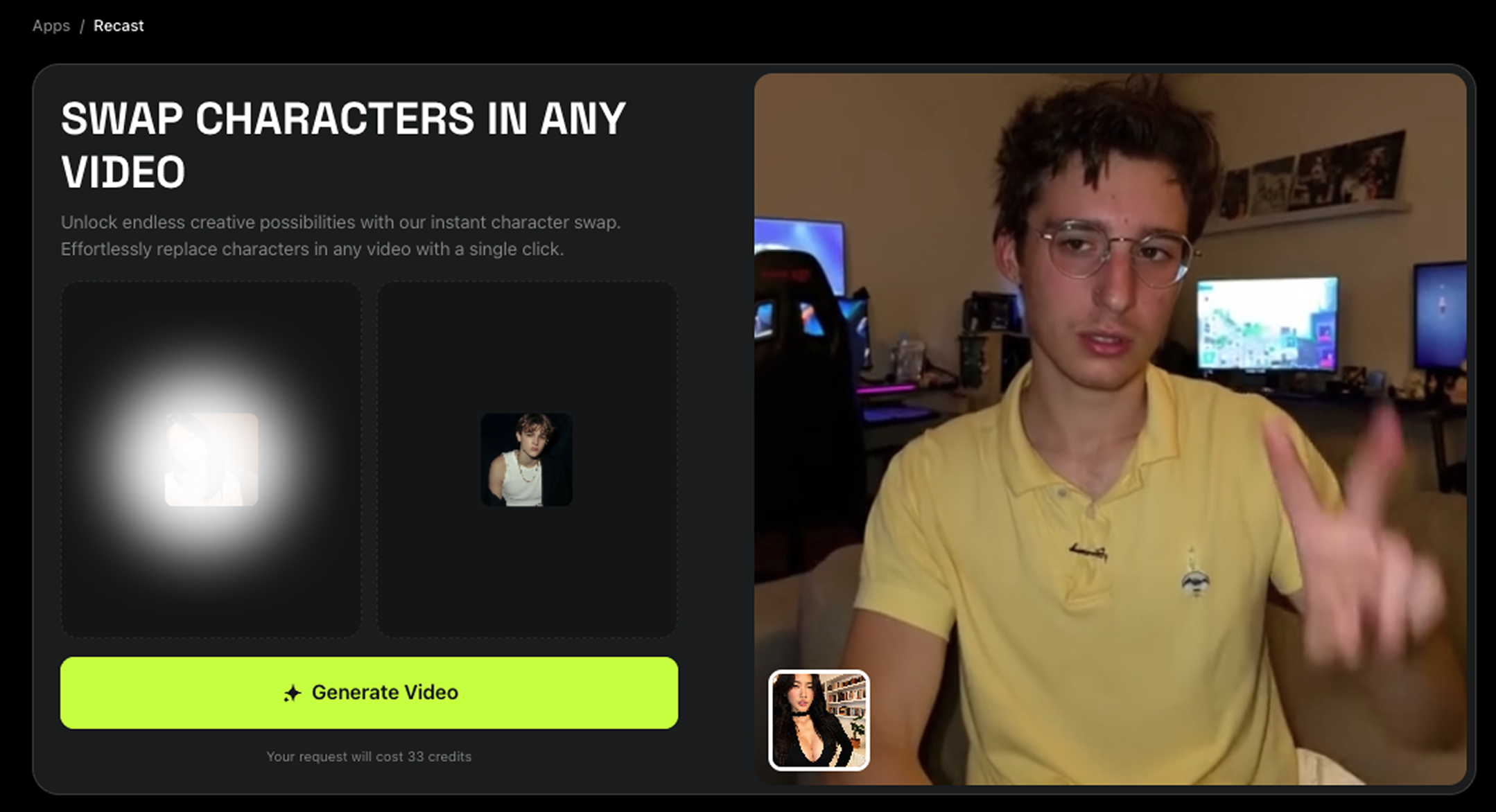 그래서 이번엔 힉스필드 Character Swap을 사용해볼게요!