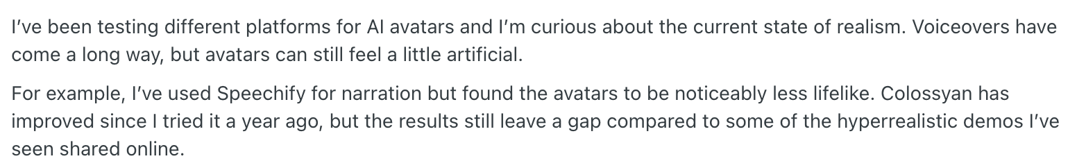 ““AI 아바타 플랫폼을 여러 개 써봤는데, 지금 기술 수준이 어느 정도 현실적으로 발전했는지 궁금함.. 음성은 꽤 자연스러워졌지만, 아바타 자체는 아직도 어딘가 인조적임!!” |