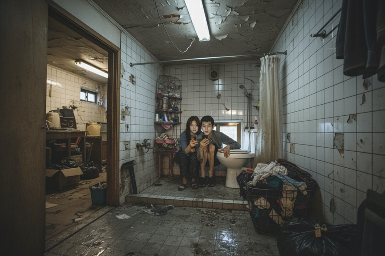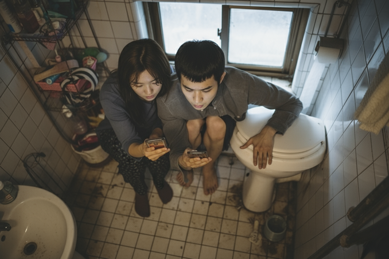 침수가 된 집안, 기우와 기정이 화장실에서 심각하게 휴대폰을 보는 장면! 지금 이 사진 속에선 두 인물만 보이지만 제가 나노바나나에게 부탁해서 여러 앵글의 씬을 만들어볼게요!