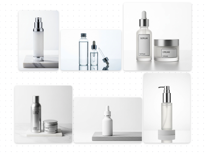 📝 "한국 20대 여성을 메인으로 한 스킨케어 브랜드 톤앤무드. 화이트&실버 조명, 글라스·세럼 병, 청량하고 깨끗한 질감" |