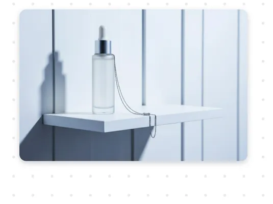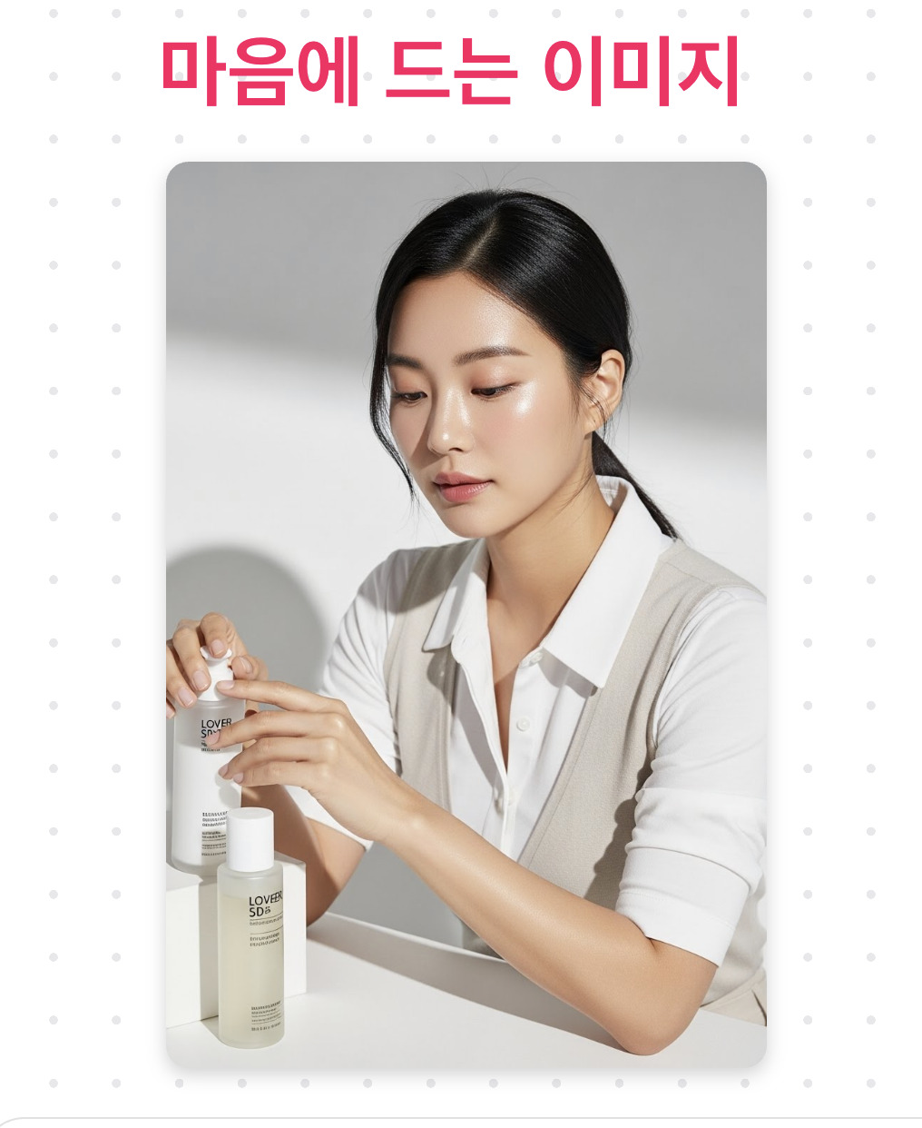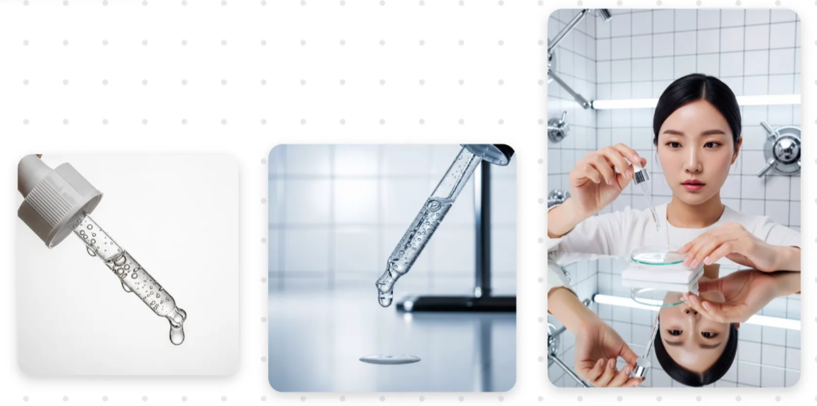 📝 "화장품 용액이 보이고, 실험실에서 실험하는 듯한 사진으로" |