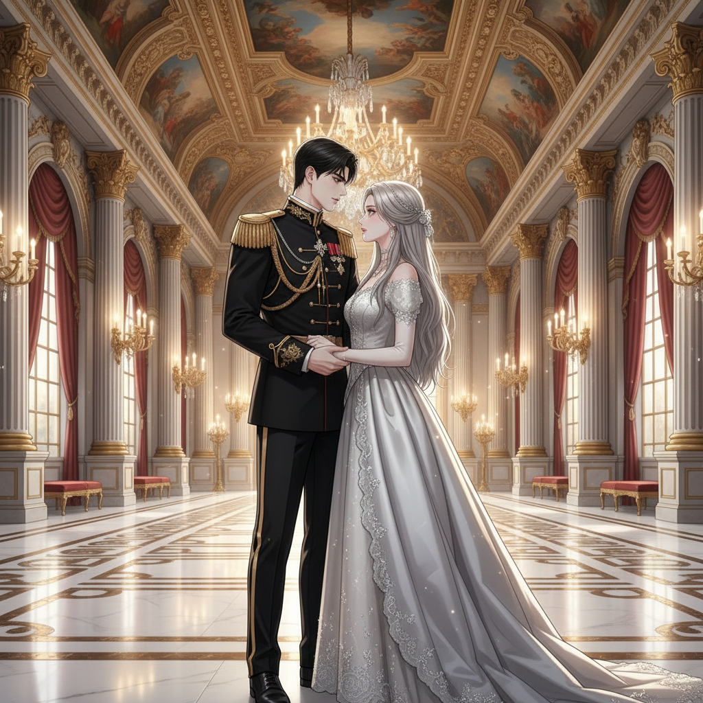 자, 여기 두 남녀 주인공이 화려한 무도회장에서 마주쳐 첫 눈에 반한 장면을 가져왔어요.