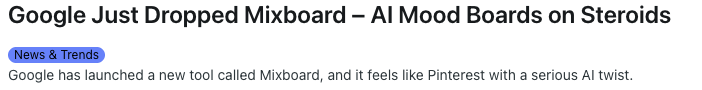 "구글이 새 툴 Mixboard를 내놨다… 마치 Pinterest 같지만 AI가 강력히 접목된 느낌이다.” |