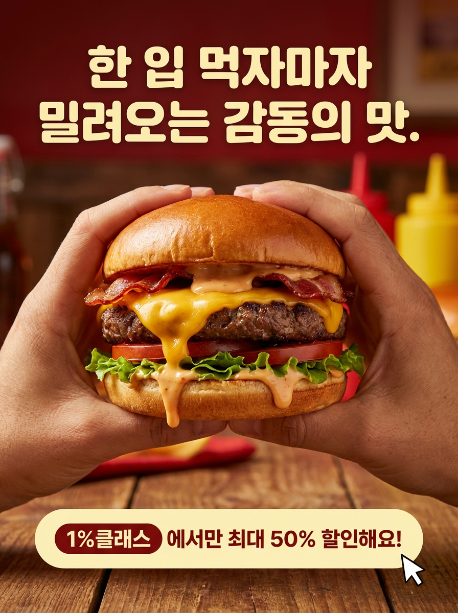 📝 "메타 광고를 위한 수제 치즈 햄버거 광고 소재 이미지를 제작할 예정이야. 첨부한 사진의 구도를 참고해서, 맛있는 햄버거와, 그걸 손으로 들고있는 사람의 손 사진을 포함하여 소재 이미지를 제작해주세요. 전반적인 톤은 빨간색과 연한 노란색.카피는 상단에 "한 입 먹자마자 밀려오는 감동의 맛." 하단에는 클릭을 유도하도록 "1%클래스 에서만 최대 50% 할인해요!" 로 써주세요." |
