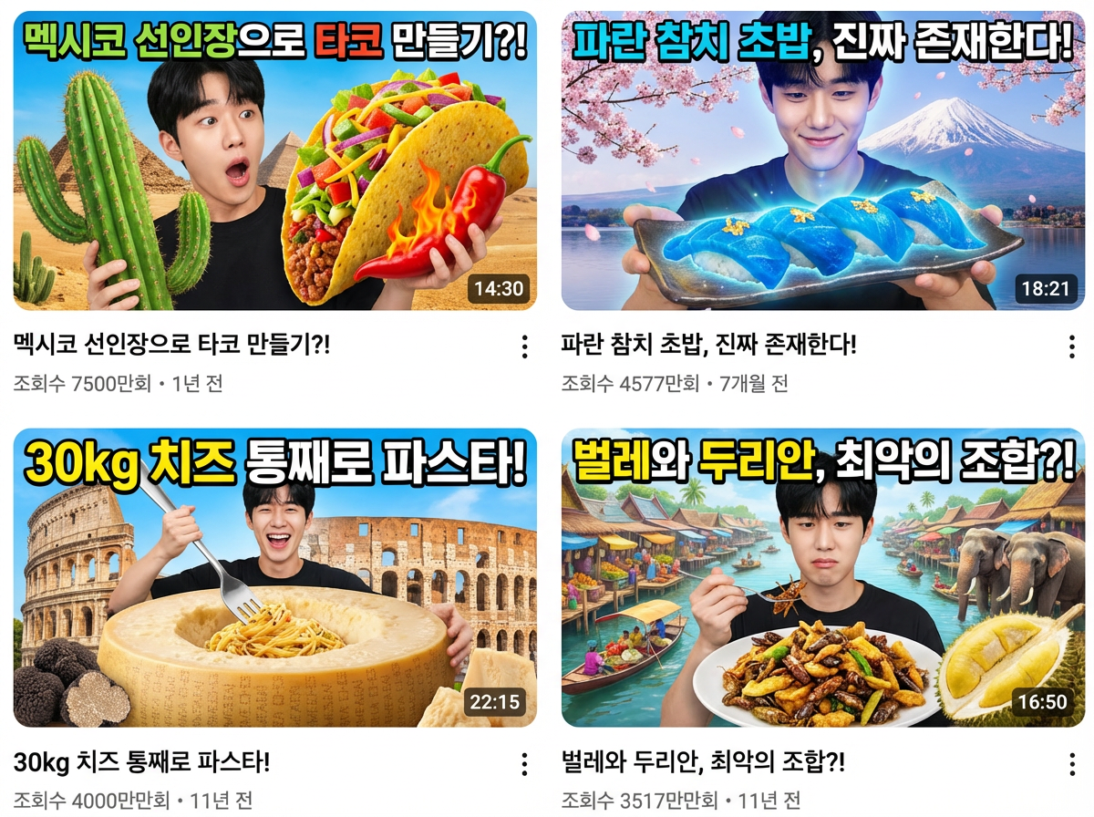 📝 "이런 종류의 유튜브 썸네일을 만들고 싶어. 이 사람이 주인공으로 나오게. 세계 각국 재료로 신기한 요리를한다.라는 주제로 썸네일을 4개 만들어줘" |