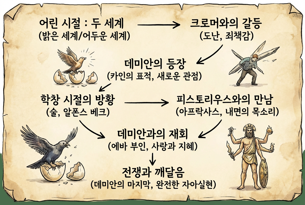 📝 "‘데미안’ 책 내용에 대한 플로우차트를 이미지로 만들어줘" |