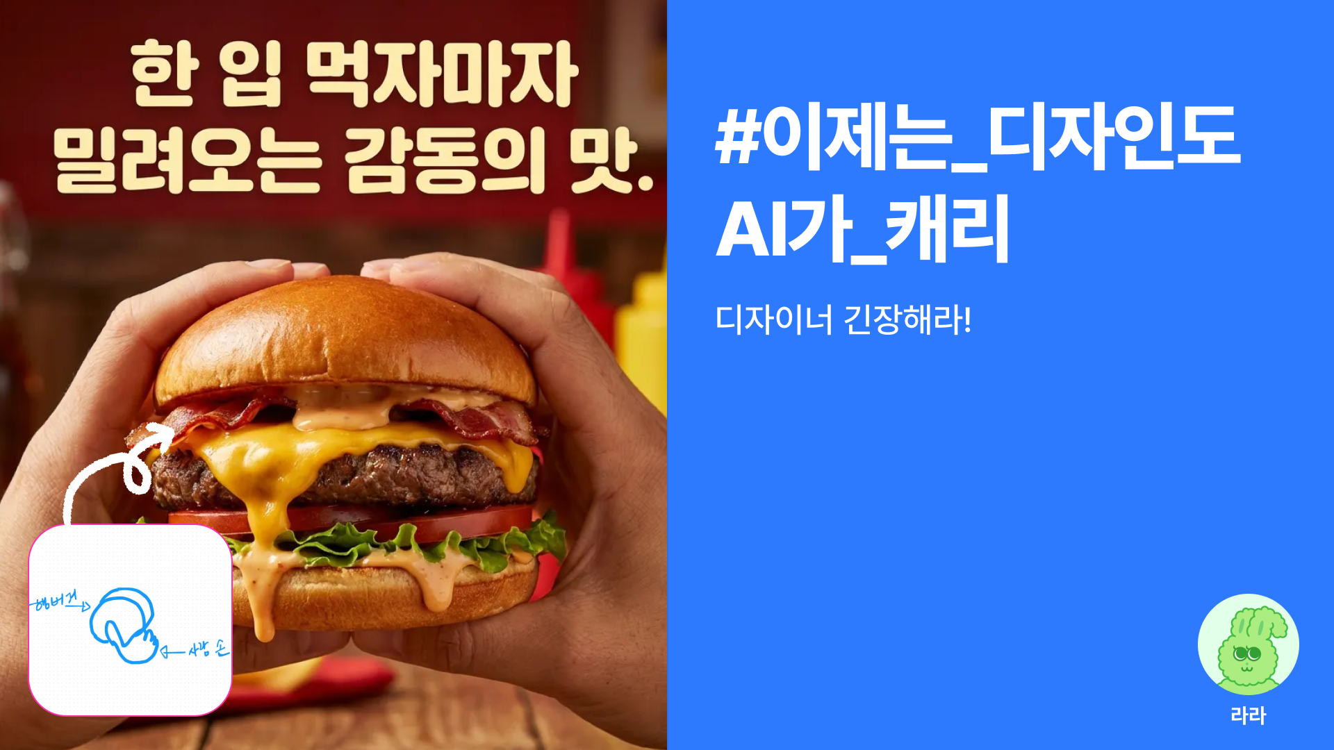 치즈가 흐르는 리얼한 햄버거는 기본이고, 에디터가 콕 집어서 요청했던 ‘햄버거를 손으로 잡고 있는 손’까지 완벽하게 구현! 찰떡같은 자막 디자인까지!!