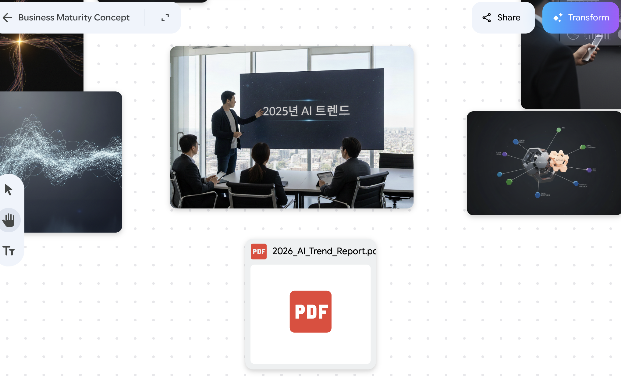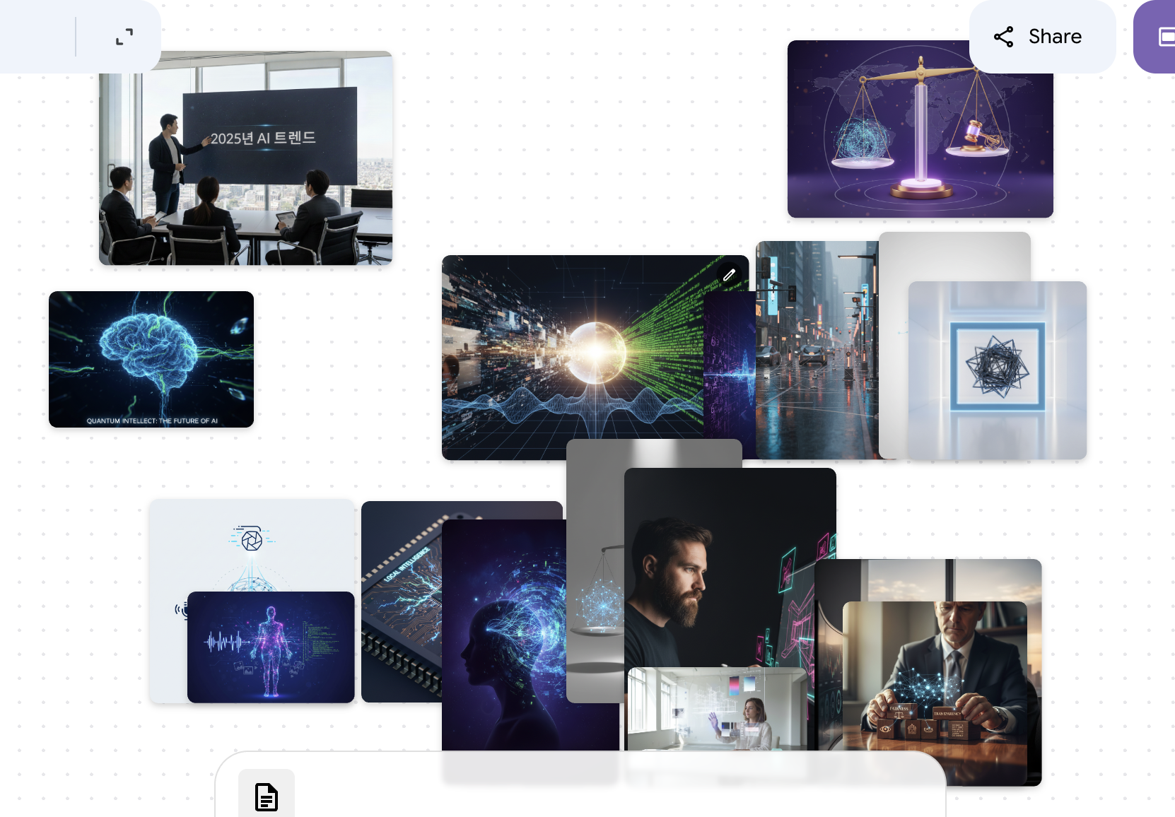 나노바나나 프로가 보드에 담긴 텍스트·이미지·구조를 함께 이해하고, 그 흐름을 바탕으로 발표용 슬라이드 구조로 재구성해줌.
