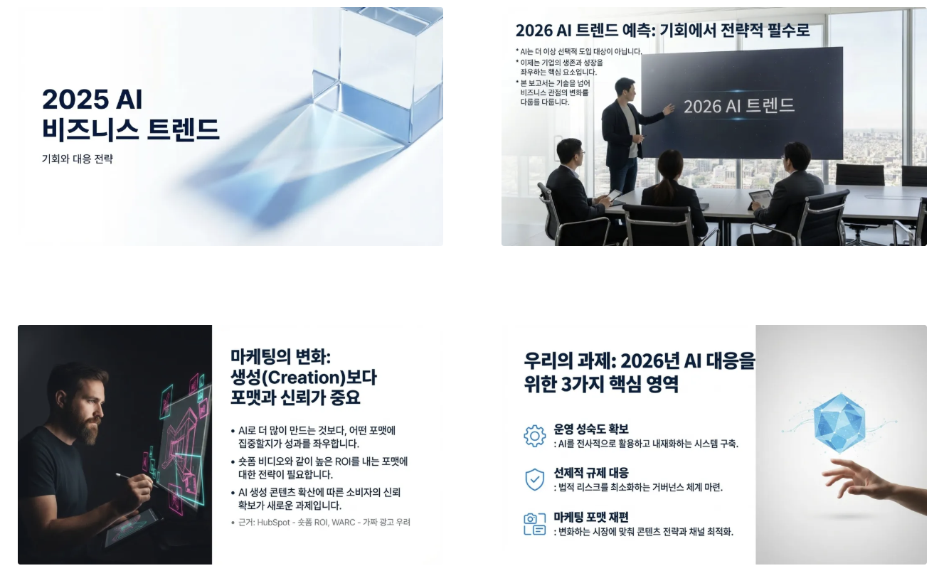 물론 실무에서 바로 쓰는 최종 PPT 퀄리티까지는 아니지만, 아이디어 회의 후 빠르게 초안을 여러 개 만들어보는 용도로는 최고입니다 👍 |
