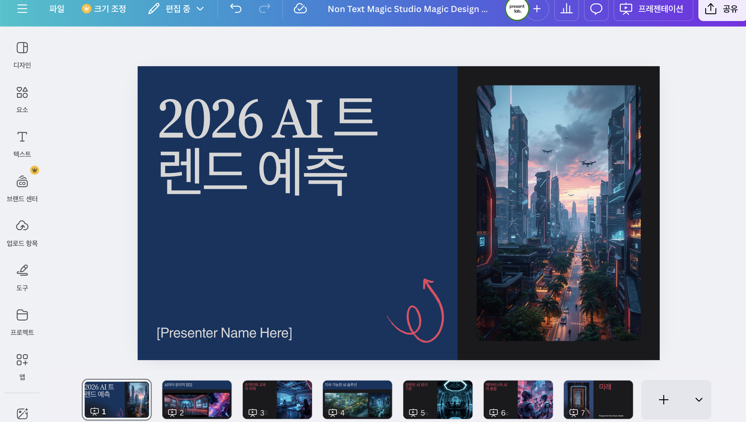 이렇게 만든 PPT는 바로 공유하거나, 곧장 슬라이드 화면으로 넘어가 발표에 사용할 수 있어요.