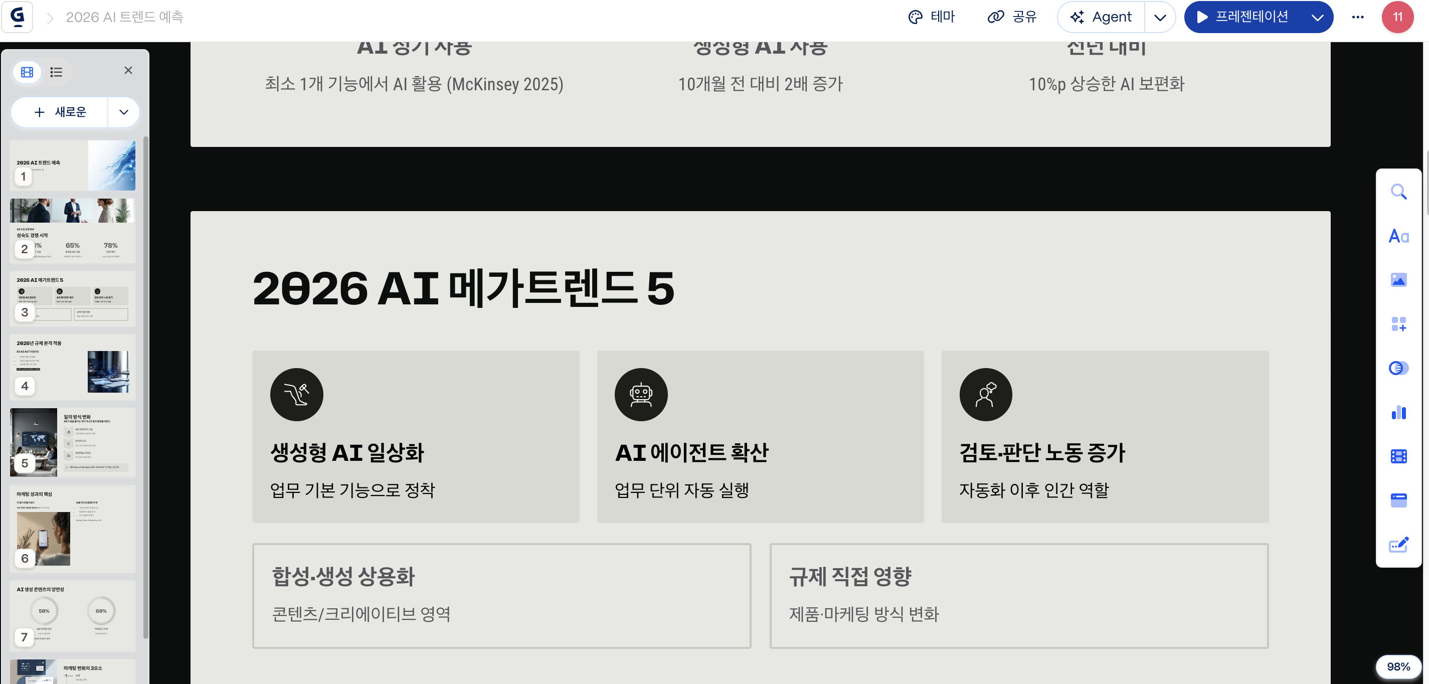 엄청난 고퀄리티까지는 아니지만, 자료를 스스로 이해하고 맥락에 맞춰 슬라이드를 짜잔— 하고 만들어준다는 점이 꽤 놀라웠어요 :)