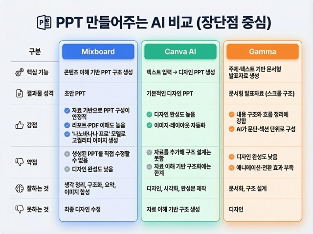 이해하기 쉽게, 다른 PPT AI 툴들이랑 믹스보드를 한눈에 비교해서 정리해봤어요! |
