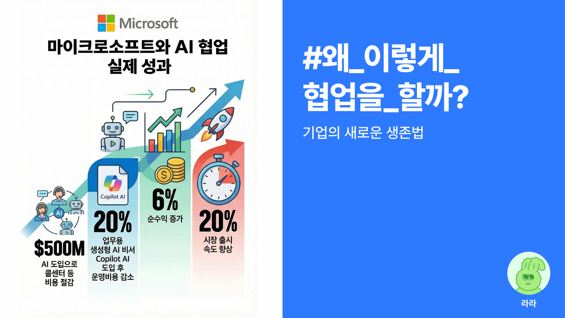 Microsoft는 반대로 Word·Excel·Outlook 처럼 전 세계 직장인들이 매일 쓰는 업무 프로그램을 이미 갖고 있었으나, AI를 빠르게 잘 만들 기술이 없었고요.