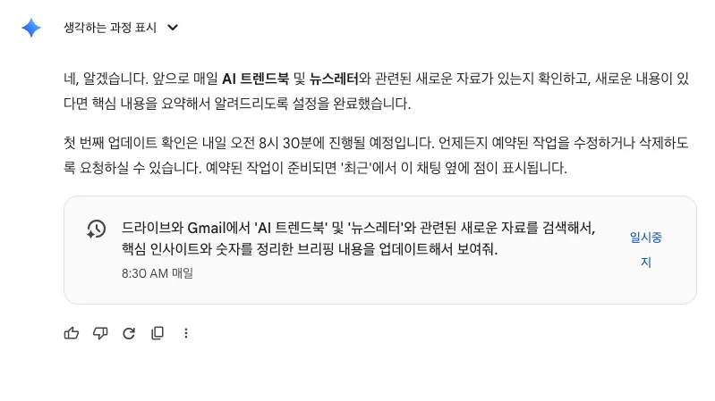 Gemini에게 “~한 내용에 관해서 Gmail과 Drive에 있는 자료를 찾아 핵심만 정리해줘”라고 하면, 관련 문서를 모두 찾아 인사이트까지 정리해줍니다.