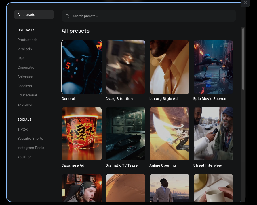 먼저 프리셋 선택 창을 열면, 스트리머 / 길거리 인터뷰 / 애니메이션 영화 등 잘 팔리는 영상 공식이 프리셋으로 쫙 깔려 있습니다.