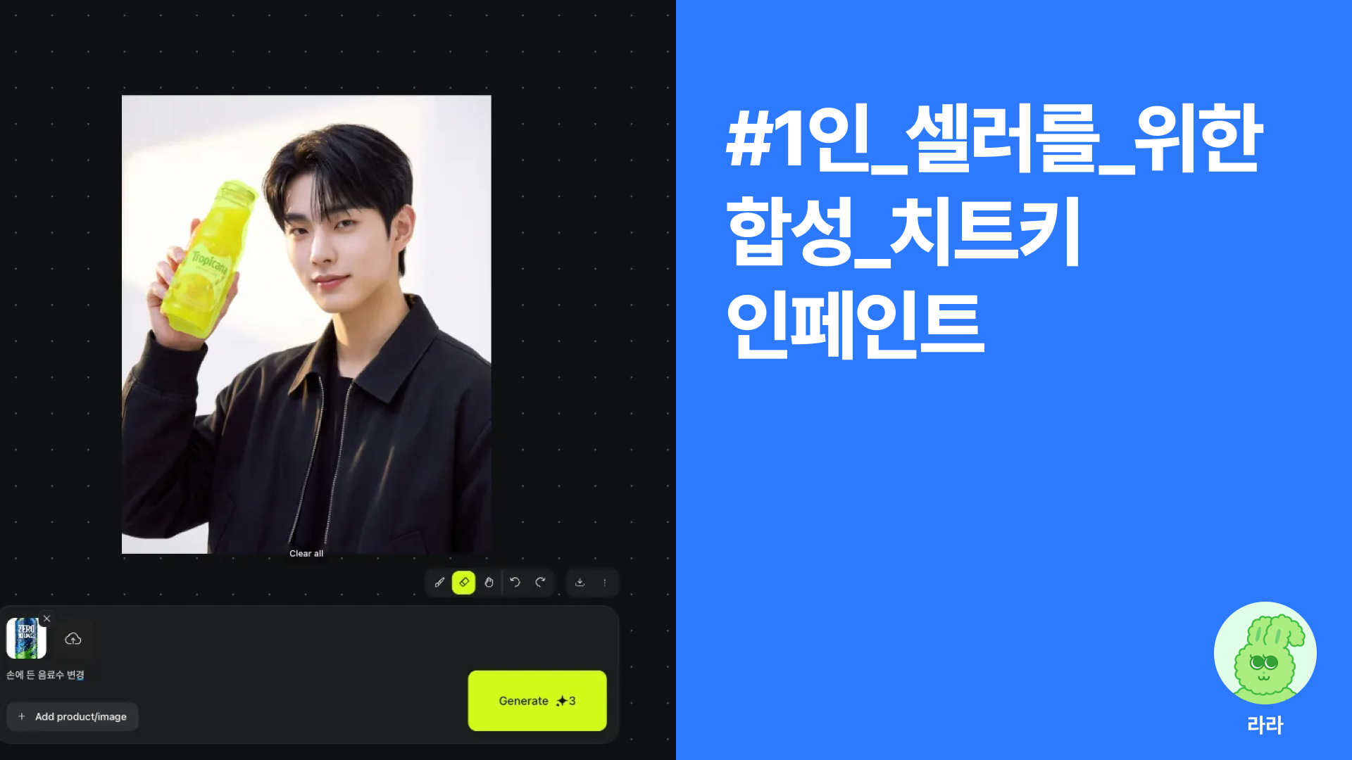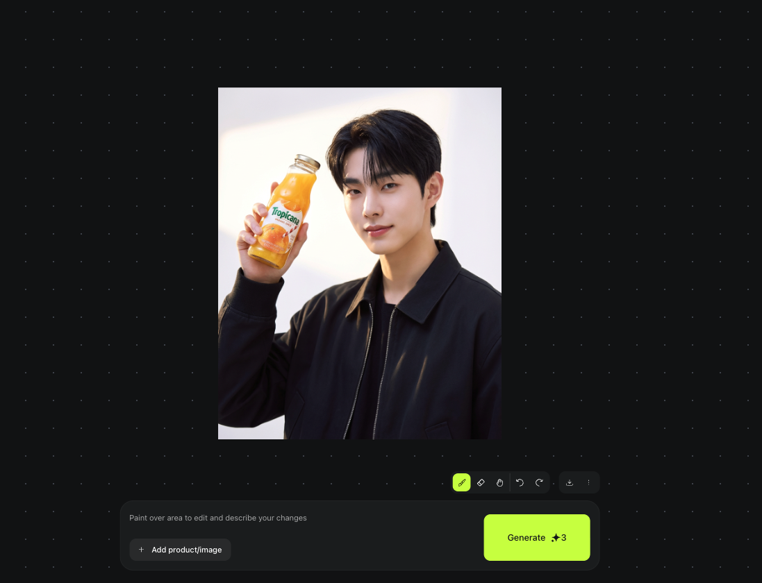 사진 전체를 갈아엎을 필요 없이, 모델의 옷만 바꾸거나 손에 든 음료수를 내 제품으로 싹!! 교체하는 등 '특정 영역'만 깔끔하게 정밀 수정해주는 기능입니다.
