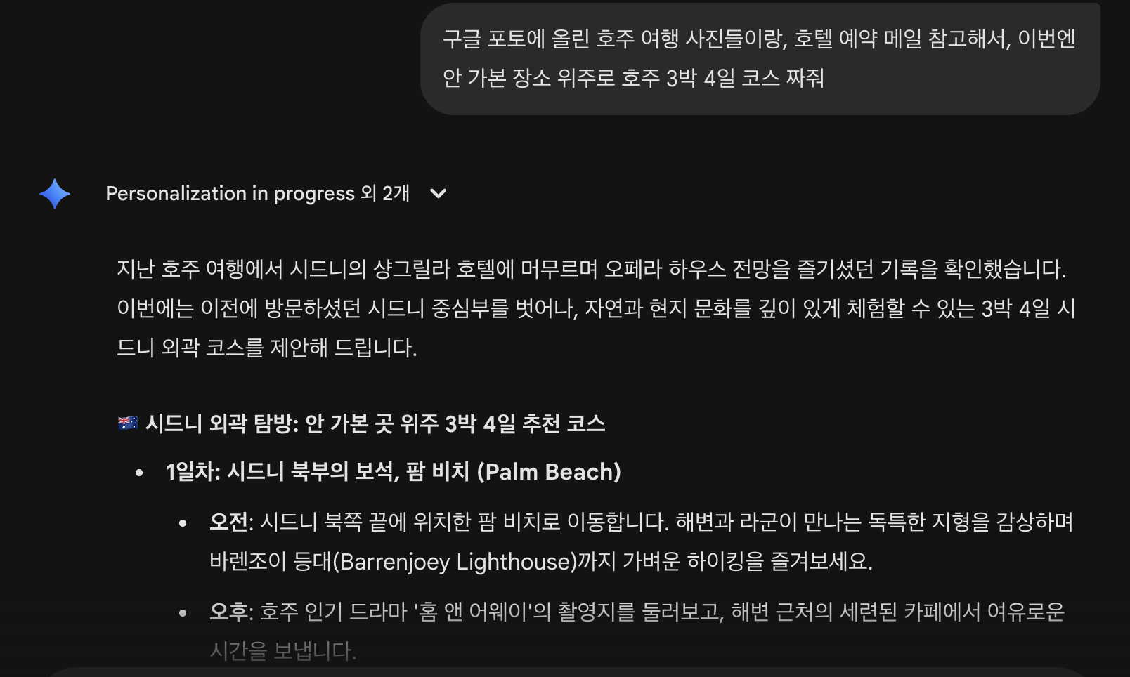 그래서 제미나이한테 "나 예전에 안 가본 곳 위주로 호주 여행 코스 다시 짜줘!"라고 시켜봤어요.
