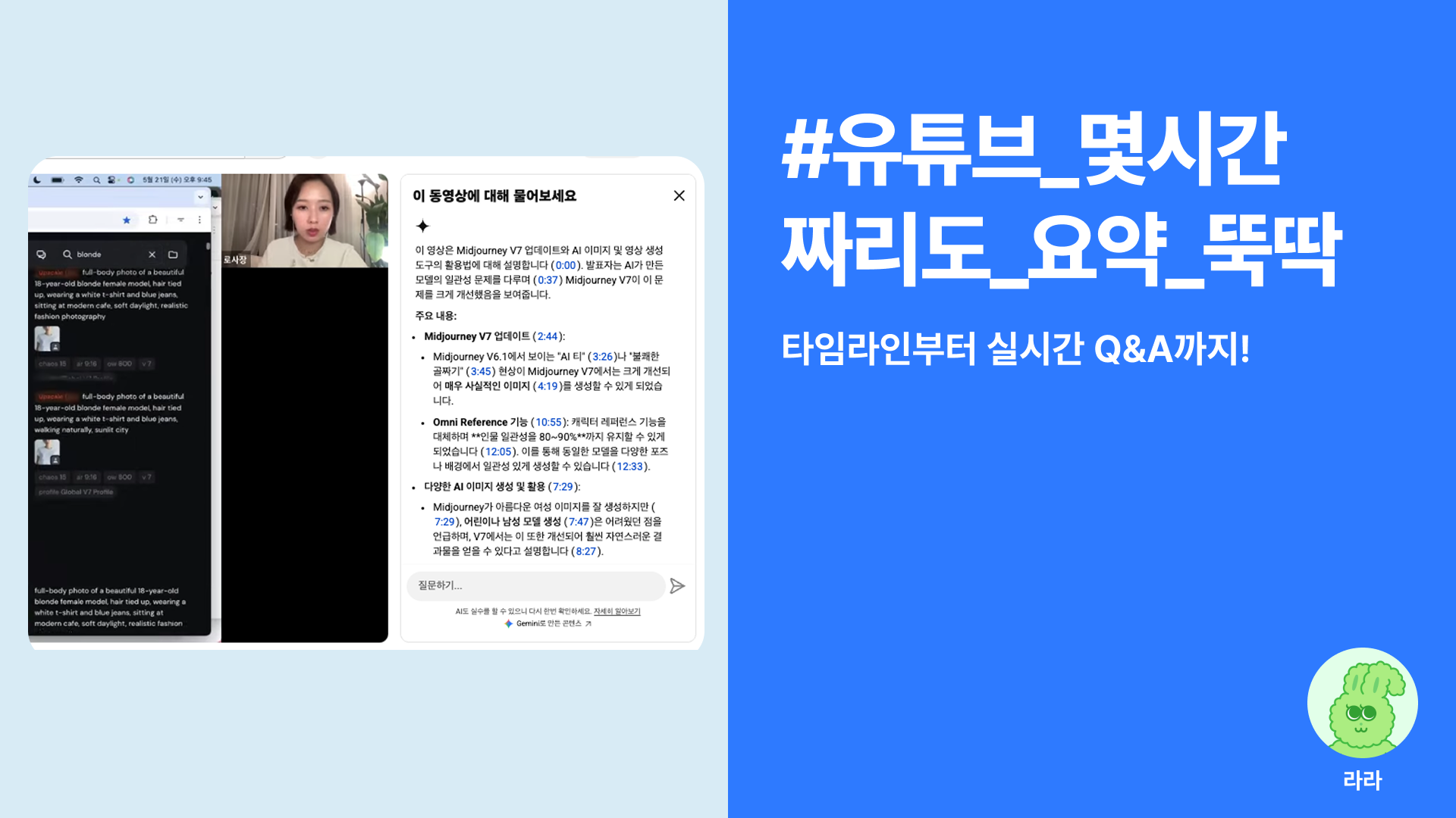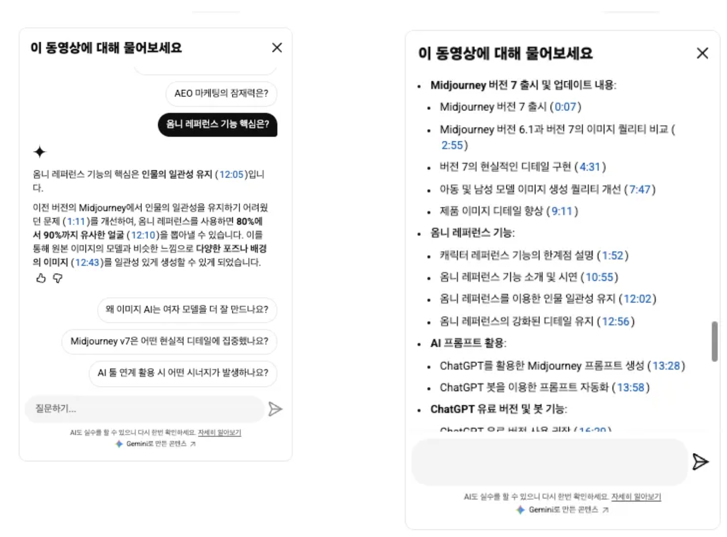 동영상 요약은 물론이고, 궁금한 점을 물어보면 영상 내용을 바탕으로 즉석에서 바로 대답해 줘요.