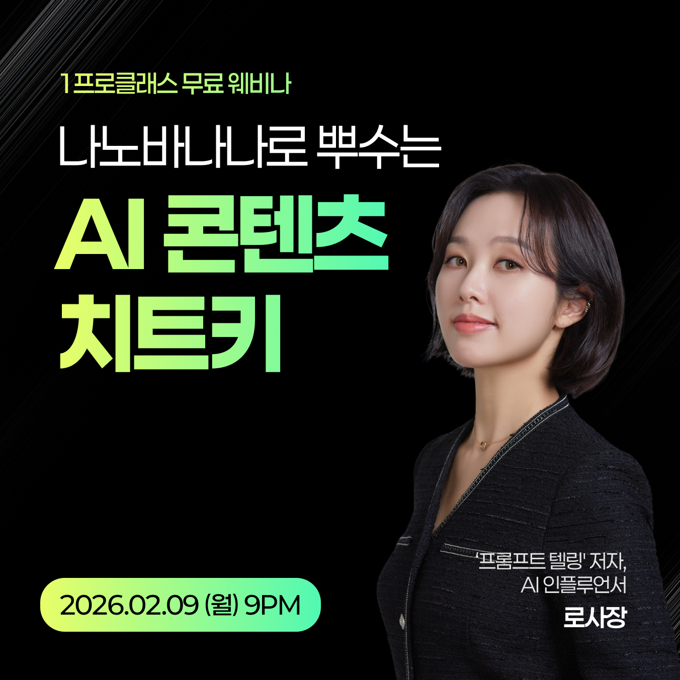 팔로워 5만 AI 인플루언서이자 베스트셀러 <프롬프트 텔링>의 저자, ‘로사장’이 그 비법을 아낌없이 전수하는 무료 웨비나를 엽니다! |