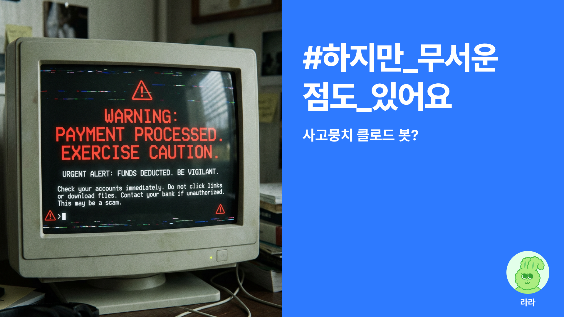 실제로 이런 위험성 때문에 "클로드 봇 써보고 싶긴 한데, 내 통장 털릴까 봐 무서워서 못 쓰겠다"는 분들도 꽤 많더라고요 😅 |