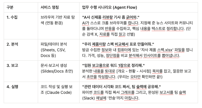 앤트로픽이 만든 AI가 채팅창을 벗어나 사용자가 권한을 부여한 파일, 브라우저, 사내 툴(Slack, CRM 등)에 직접 접근해 작업을 수행할 수 있는 ‘디지털 작업 공간’입니다. |
