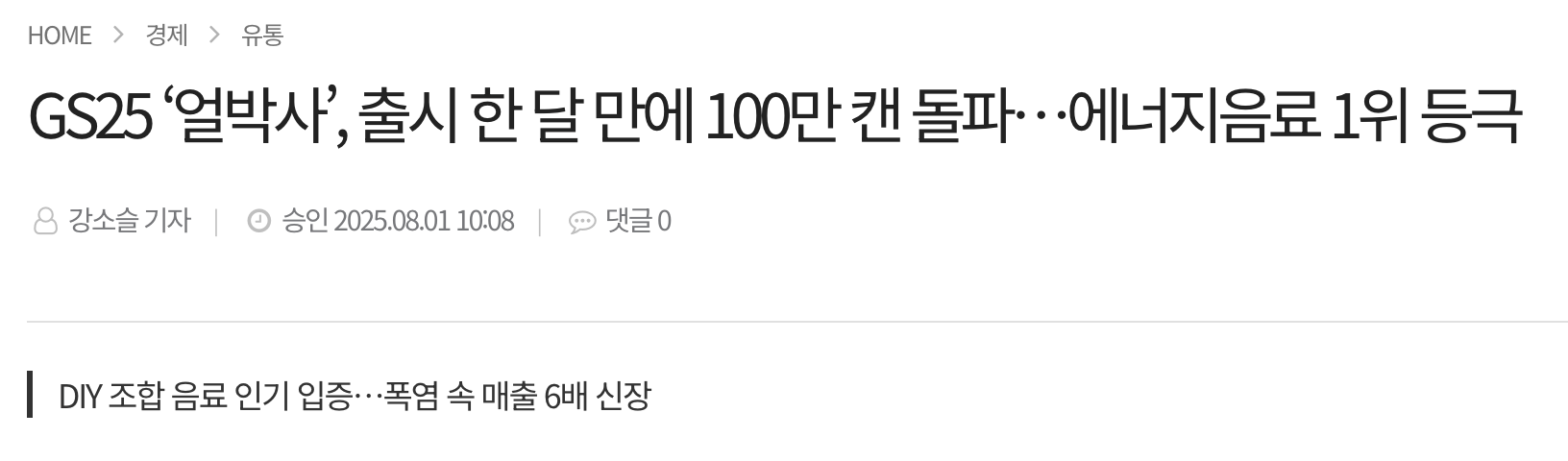 매일일보(2025.08.01), GS25 ‘얼박사’ 판매 성과 기사.