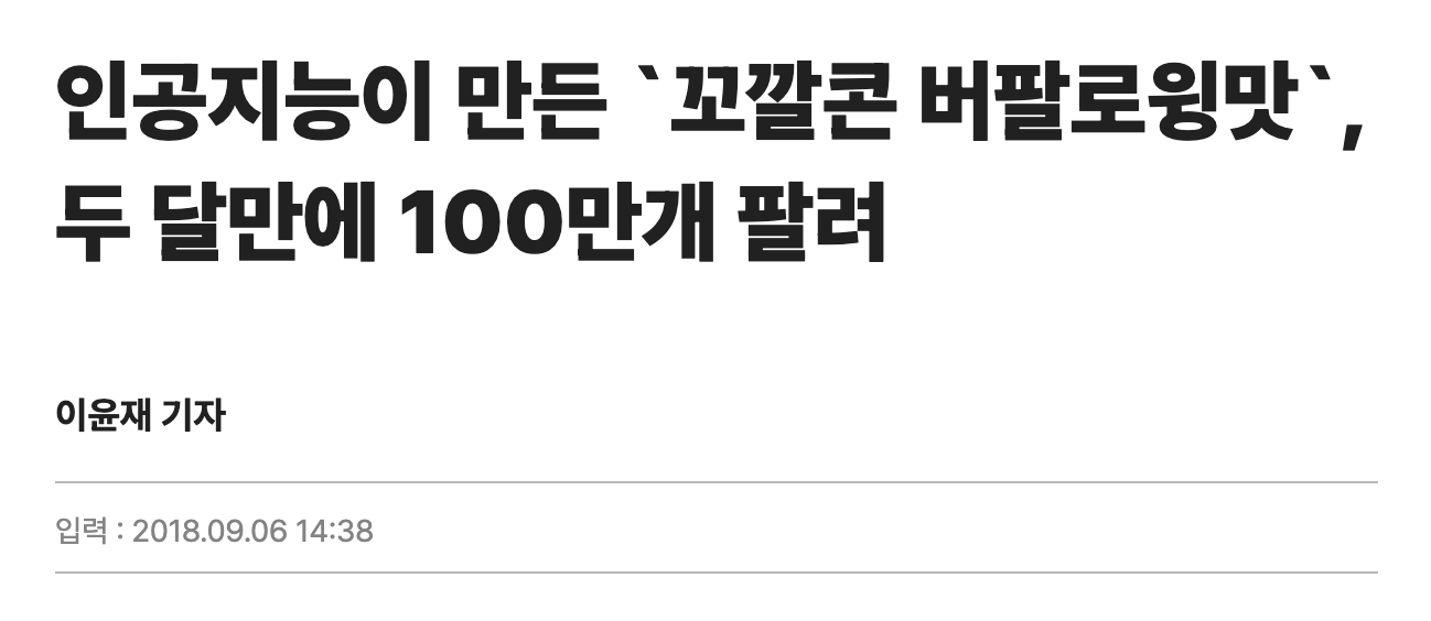 매일경제(2018.09.06), AI 기반 신제품 ‘꼬깔콘 버팔로윙맛’ 관련 보도
