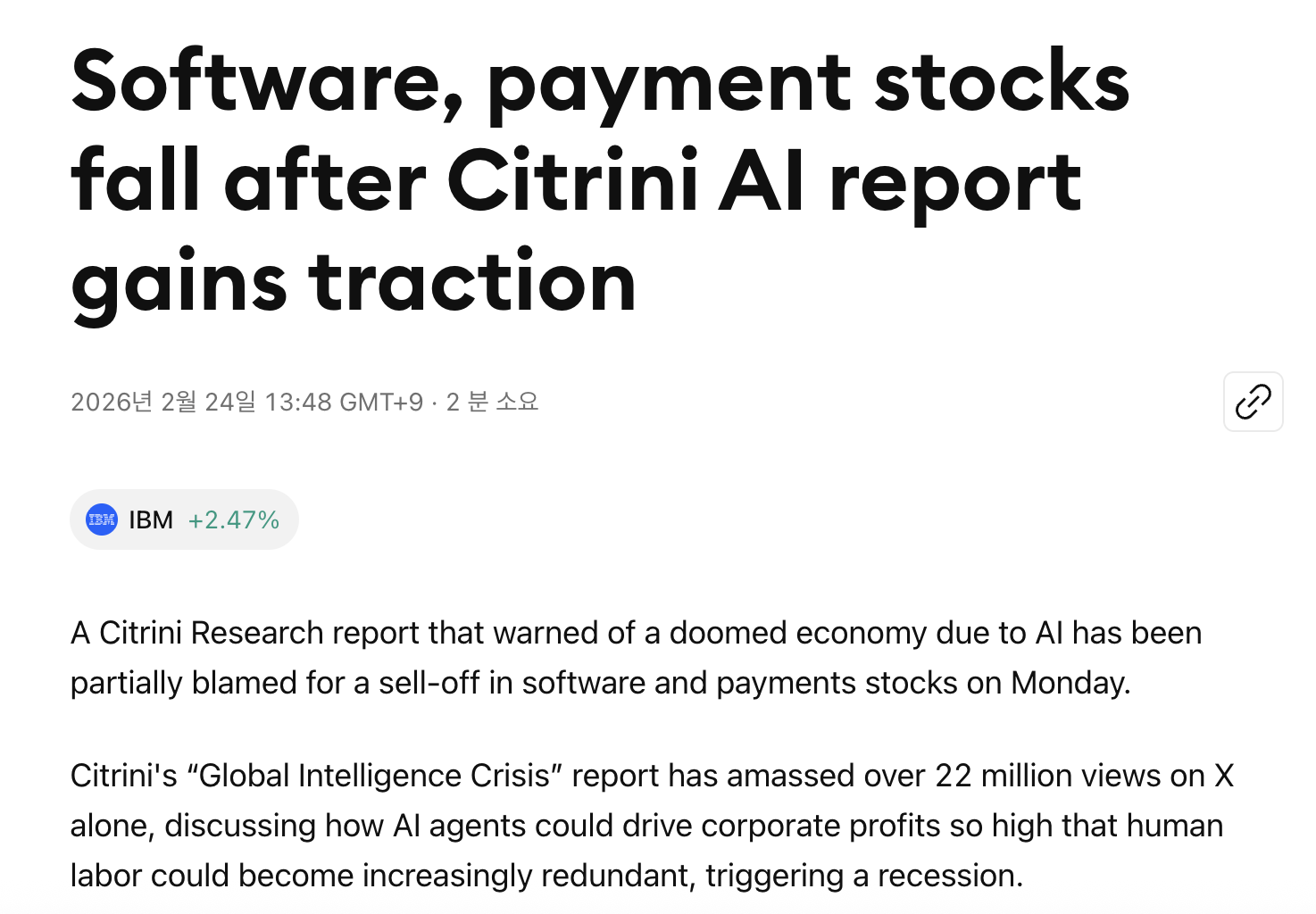 (이미지 출처- Software, payment stocks fall after Citrini AI report gains traction.” TradingView News, Feb 23, 2026.)