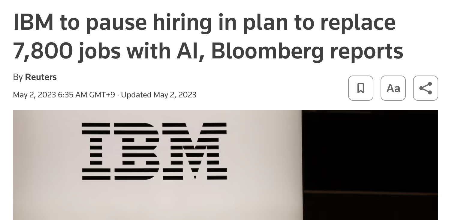 (이미지 출처 : Reuters — “IBM to pause hiring in plan to replace 7,800 jobs with AI,” May 1, 2023)