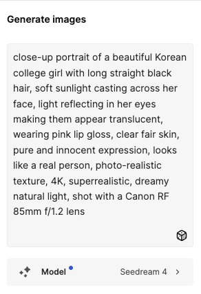 모델 생성할 때 미드저니를 많이 사용하는데 미드저니는 동양인 모델이 상대적으로 아쉬웠음.. but 시드림은 중국 회사라 그런지 아시안계 얼굴을 자연스럽게 잘 뽑아줌!