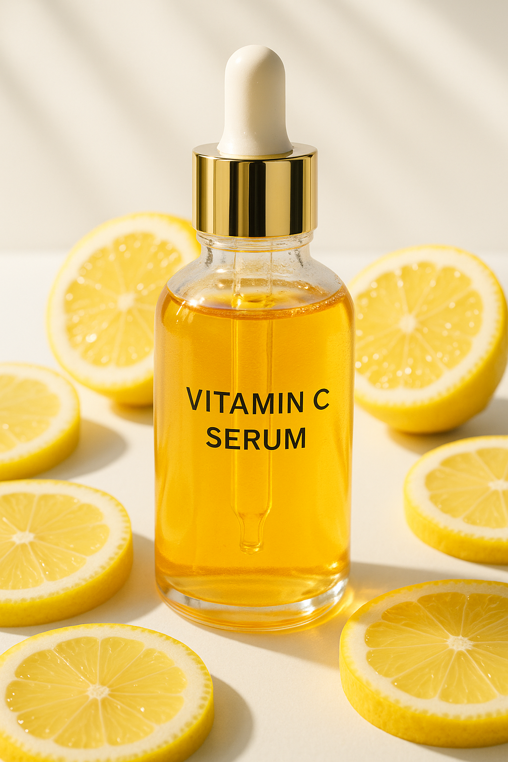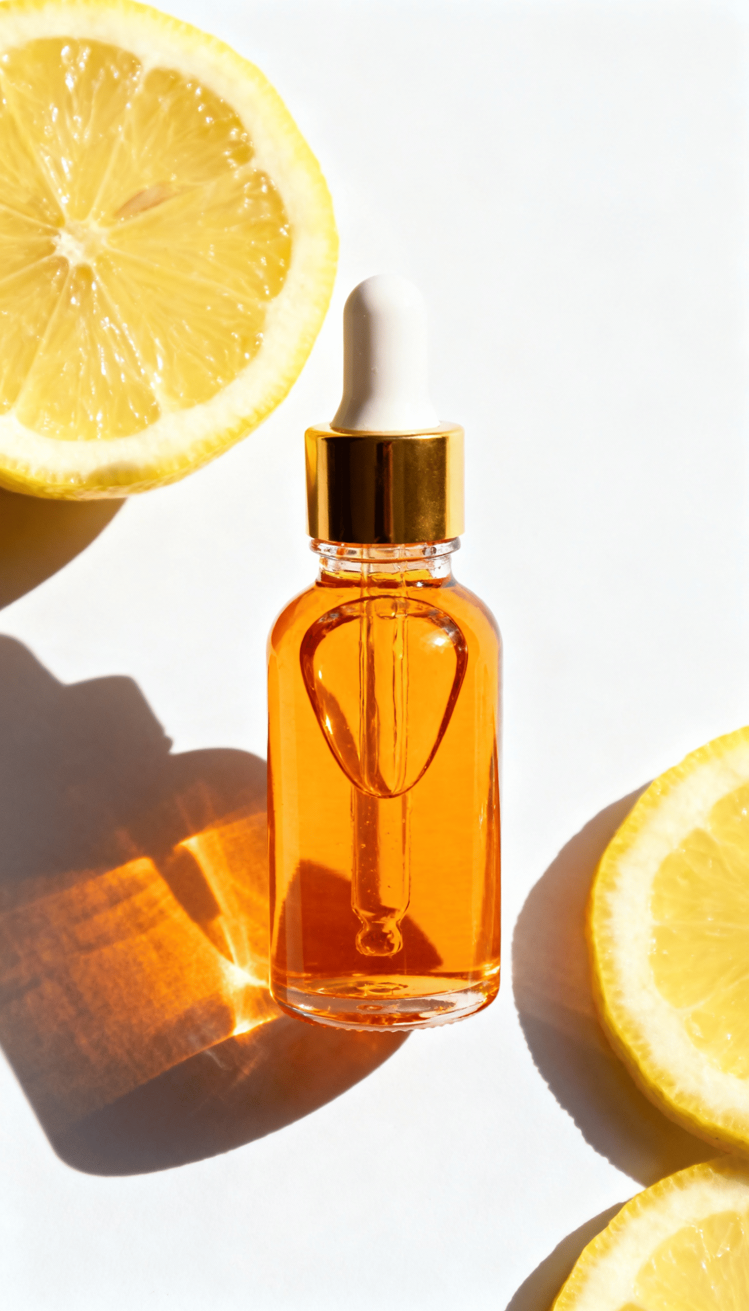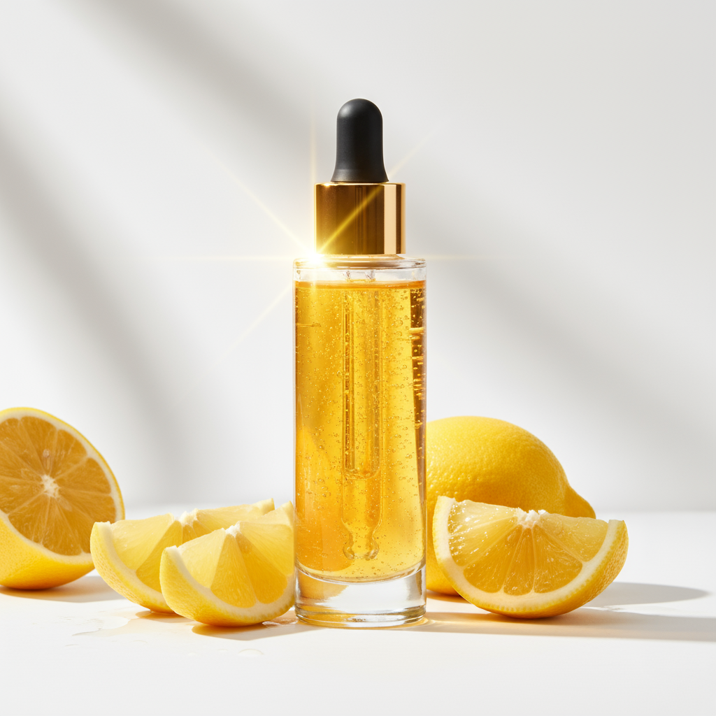 💬 " 비타민 C 세럼 화장품이 햇살에 비춰서 투명하게 빛나고, 주변엔 레몬이 있다"