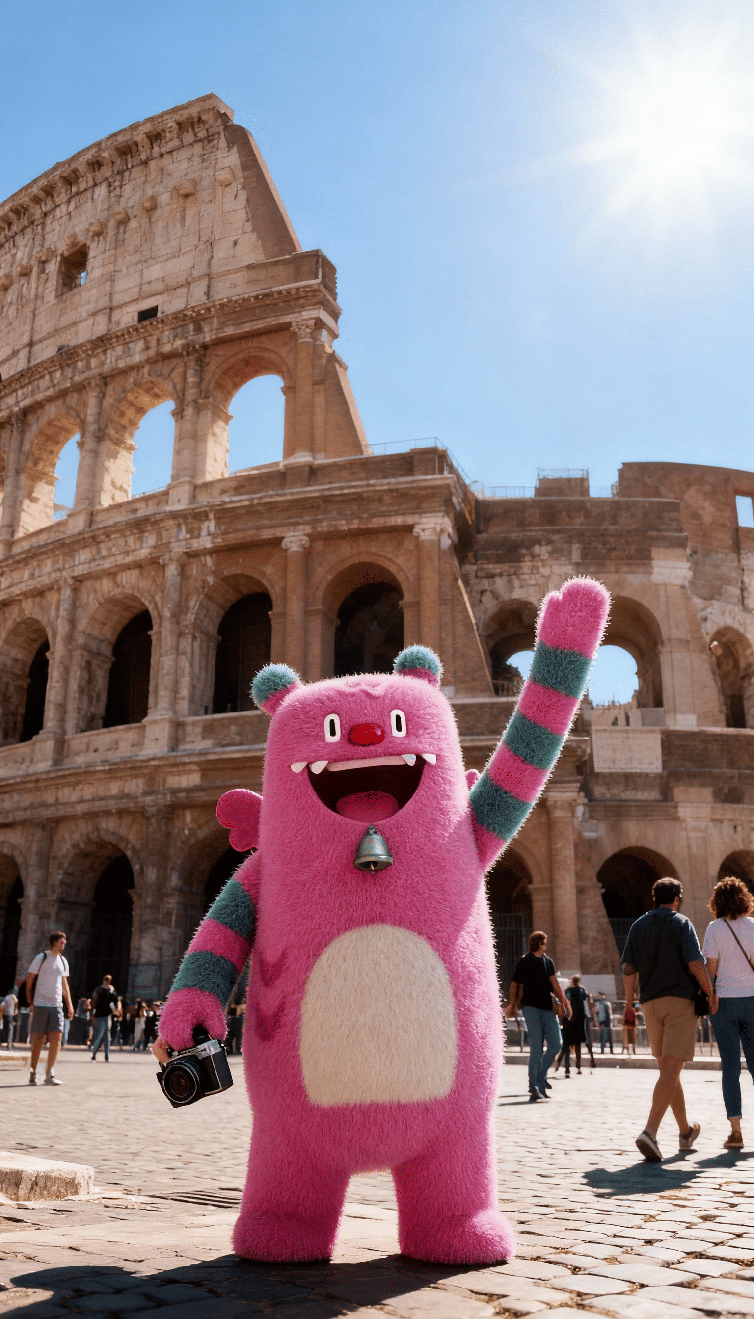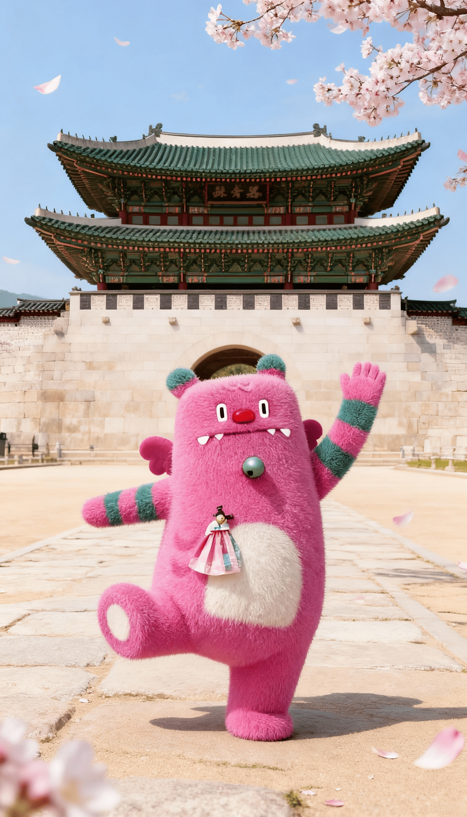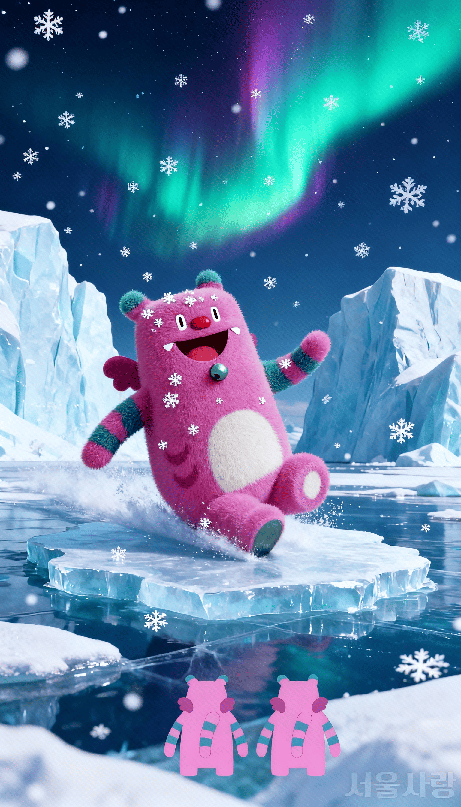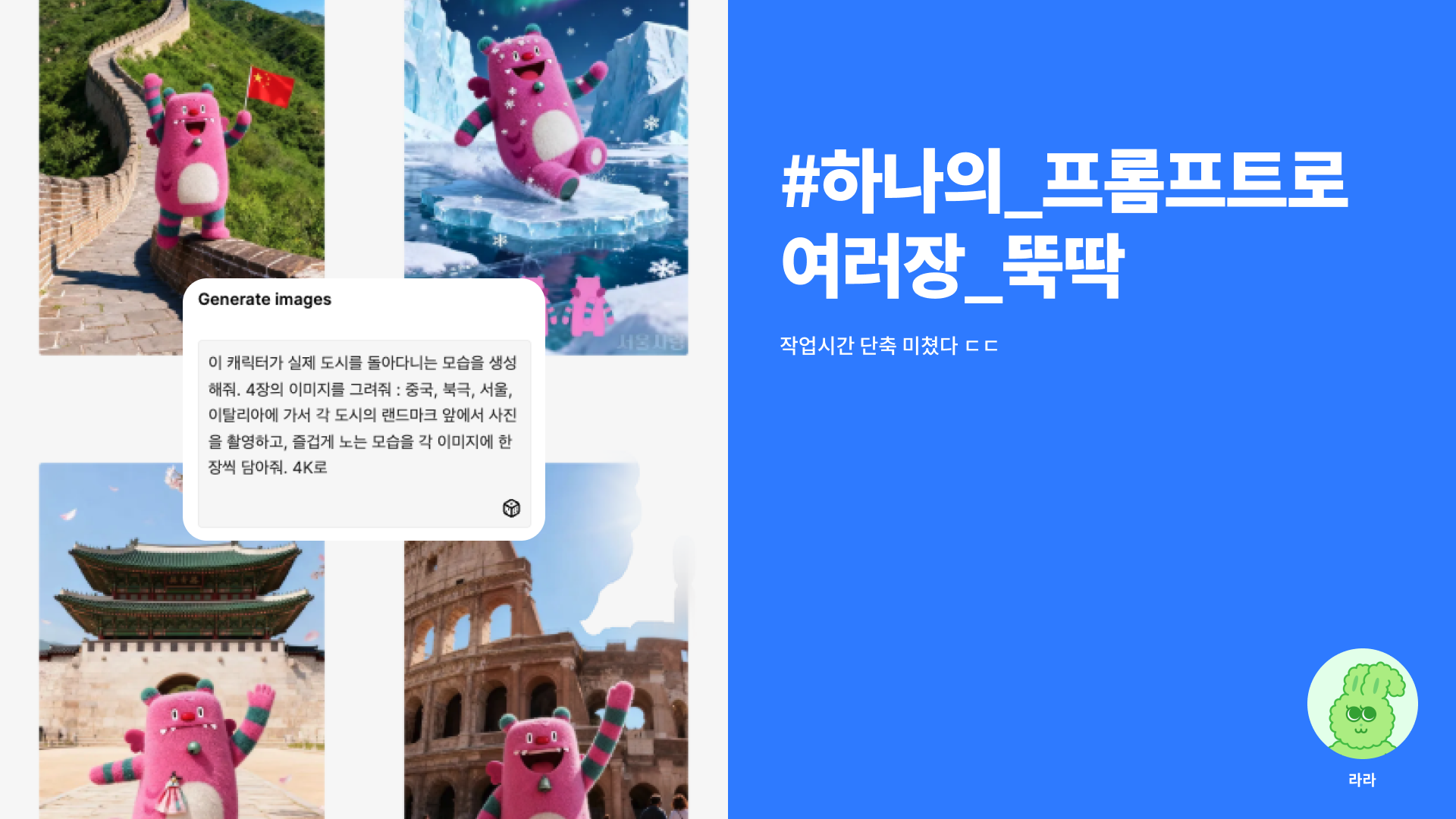 💬 " 이 캐릭터가 실제 도시를 돌아다니는 모습을 생성해 줘. 중국,남극,서울,이탈리아에 가서 각 도시의 랜드마크 앞에서 사진을 촬영하고, 즐겁게 노는 모습을 각 이미지에 한 장씩 담아줘."