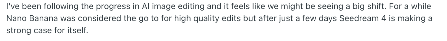 “……한동안 나노 바나나가 고퀄 이미지 편집 AI로 여겨졌지만 며칠 만에 Seedream 4가 강력한 지지를 얻고 있음!!”