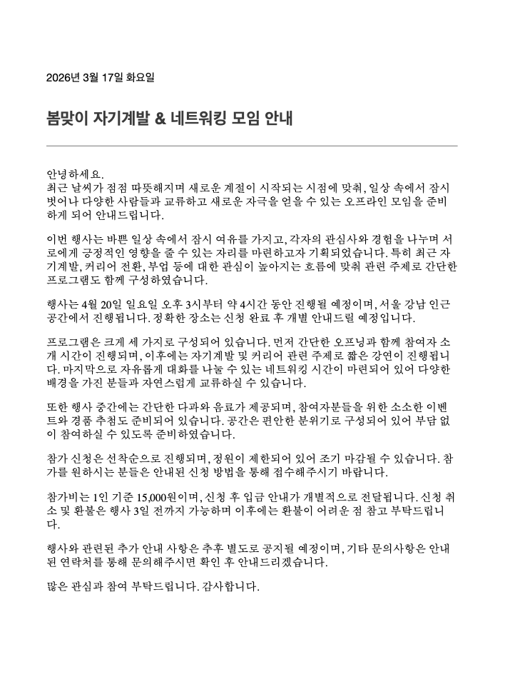 예시로 준비한 지루~한 '줄글 이벤트 행사 공지'입니다.