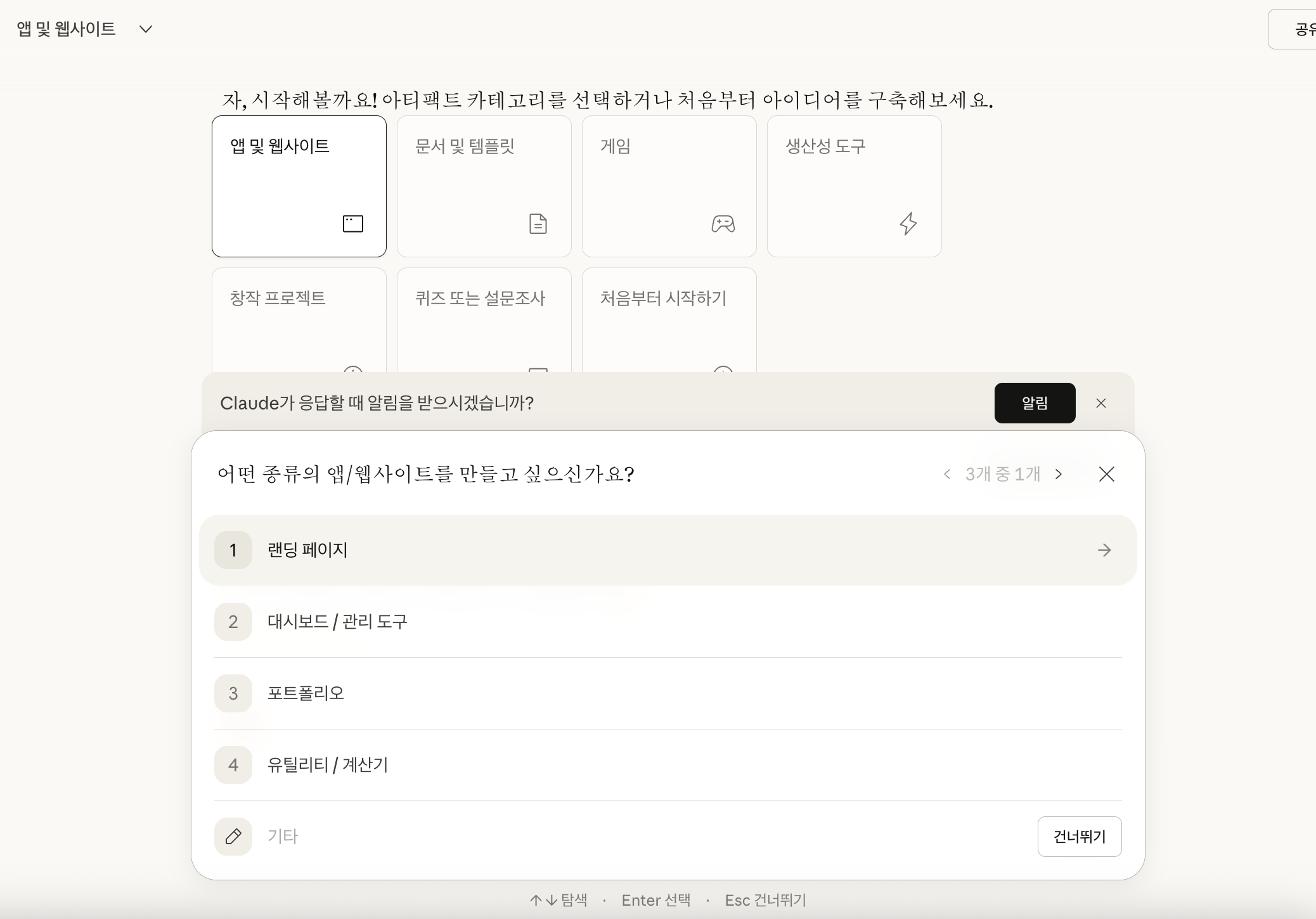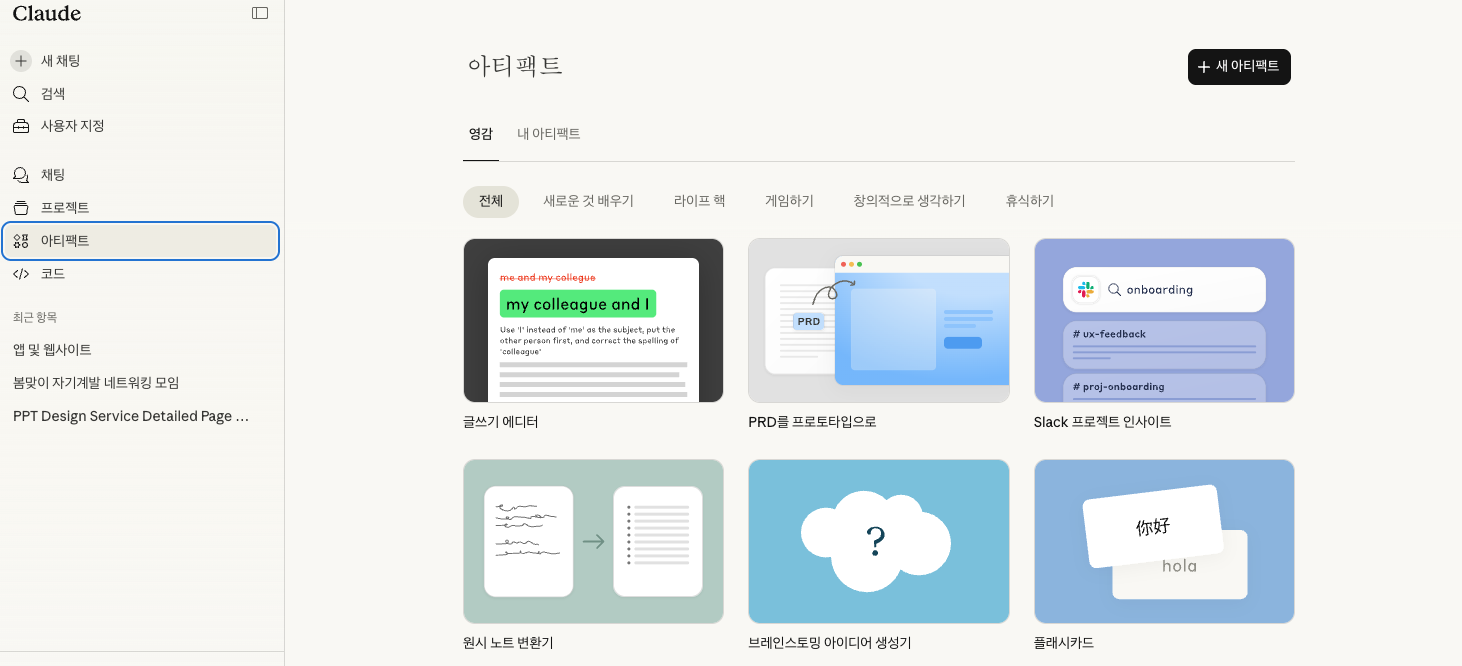 먼저 클로드 아티팩트 창에 들어가서 원하는 카테고리를 딱! 선택해 주세요. |