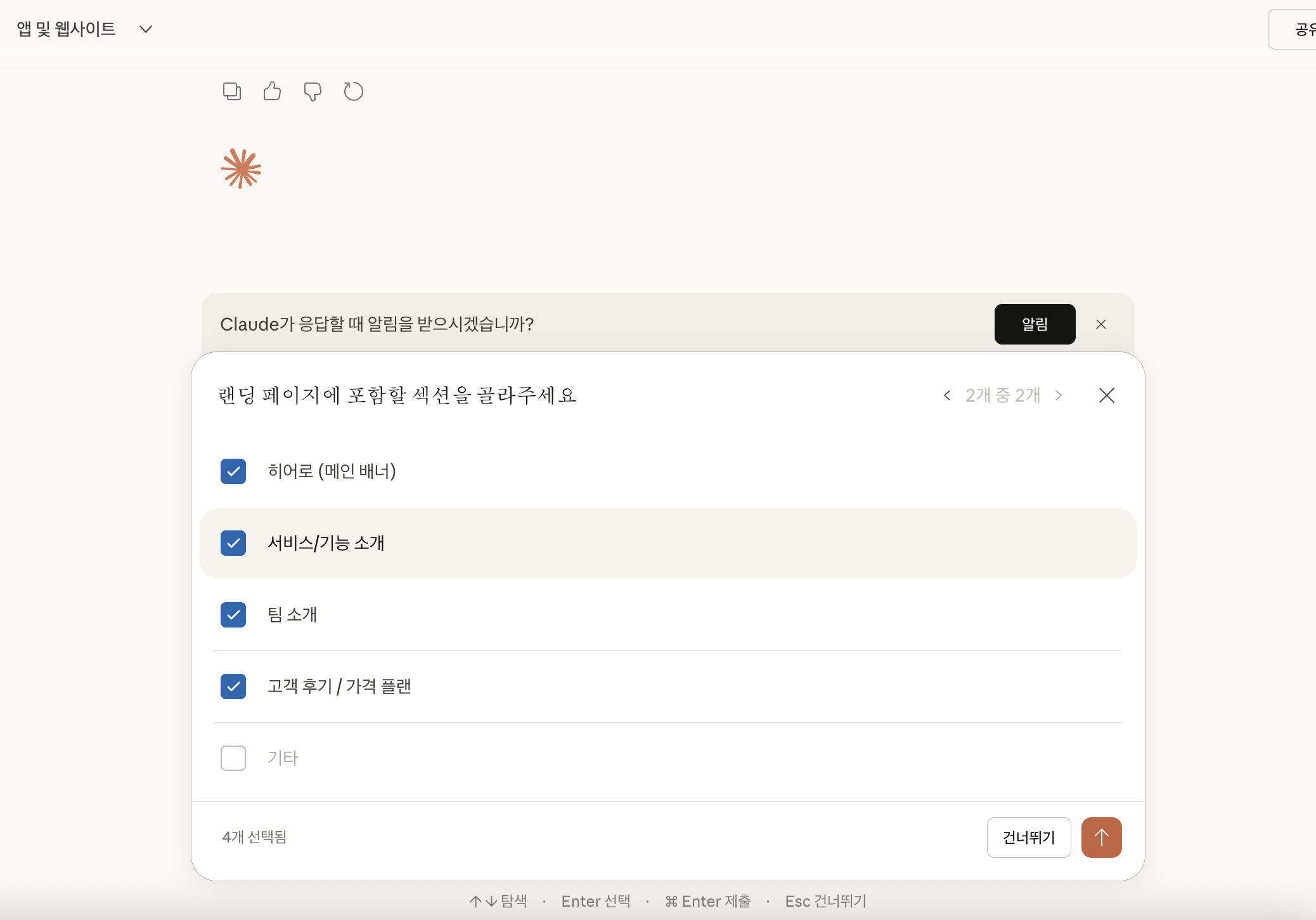 랜딩 페이지를 만들 거니까 '랜딩 페이지'를 콕 찍고, 필요한 섹션들(행사 소개, 참가 신청 버튼 등)도 야무지게 체크해 줬어요!