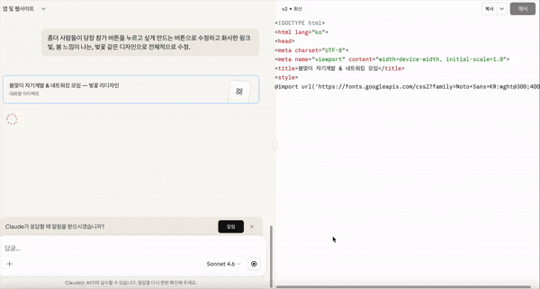 - STEP 3. 입으로 코딩하기: 첫 결과물이 나오면 채팅창에 "버튼을 파란색으로 바꿔줘", "봄 느낌 나게 해줘"라고 말해보고, 실시간으로 싹 변하는 마법 감상하기! (진짜 10분 컷 보장합니다 ⏱️)