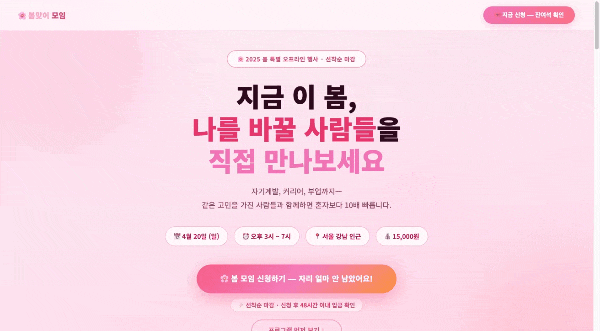 “전체적으로 봄, 벚꽃 느낌이 나도록 화사하게 수정해주고, 참가 버튼도 사람들이 더 누르고 싶게 확 띄게 바꿔줘!”