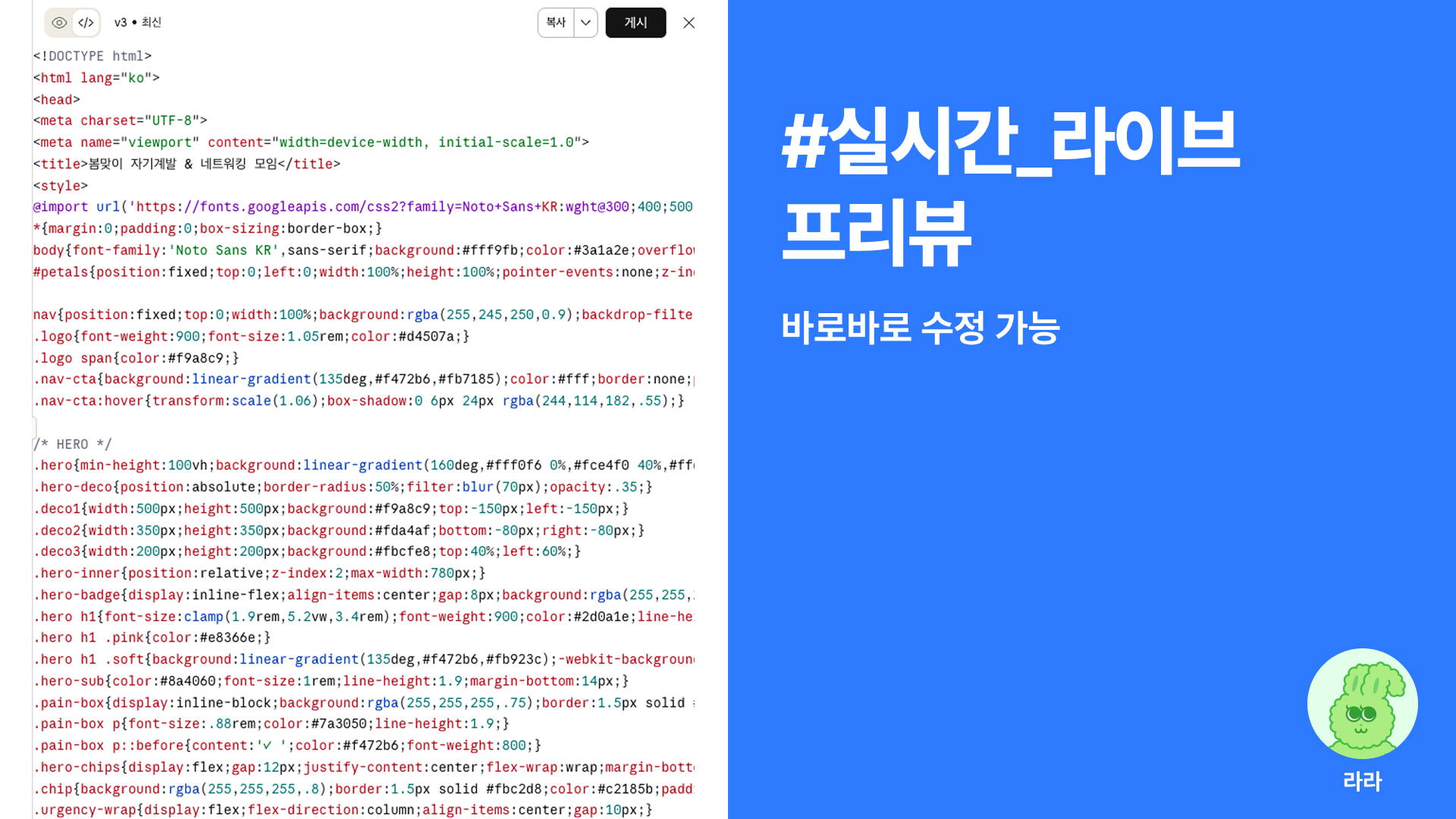 - 새로고침 없이 눈앞에서 수정해주는 라이브 프리뷰 기능