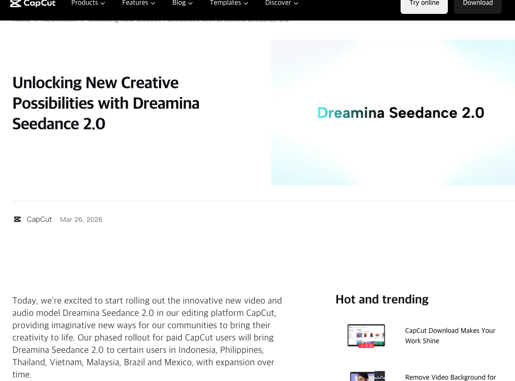 캡컷 공식 발표에 따르면, 시드림 2.0은 현재 일부 유료 사용자와 특정 시장부터 단계적으로(찔끔찔끔...) 풀고 있거든요. 초기 롤아웃 단계라 계정별로 기능 제한이 단단히 걸려있습니다. 공식 소개에는 멀티모달이 다 되는 것처럼 그럴싸하게 적혀있어도, 막상 내 화면엔 그 UI가 아예 없거나 아주 제한적으로만 보일 수 있다는 뜻이죠. ㅠ