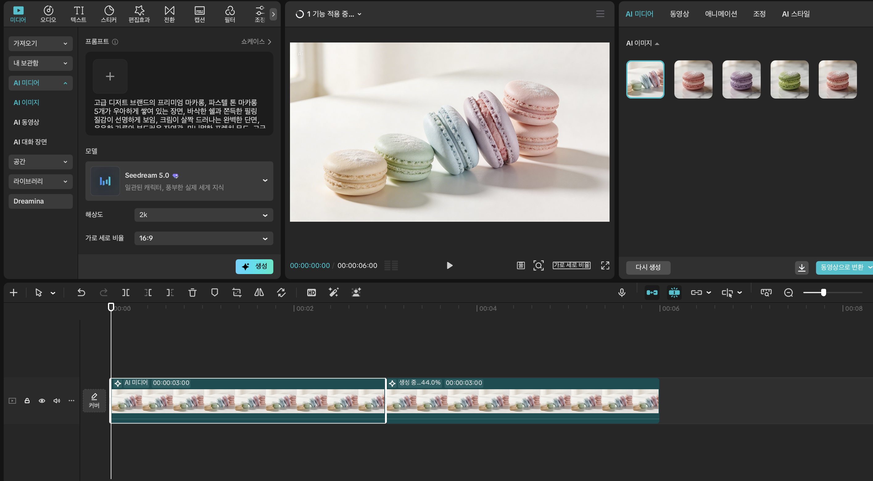 먼저 캡컷의 '시드림 5' 모델을 이용해 알록달록 예쁜 마카롱 사진을 하나 뽑아봤어요. |